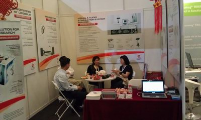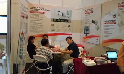 6月的北京正值夏初,剛被一場(chǎng)大雨洗刷過(guò),涼風(fēng)習(xí)習(xí)、空氣清新。深圳美德公司一行人行色匆匆,奔赴北京國(guó)家會(huì)議中心,精心布置展臺(tái),以迎接這難得在祖國(guó)大地舉行的盛會(huì)。美德公司的展臺(tái)別具中國(guó)特色,展臺(tái)上方懸掛的2個(gè)大紅中國(guó)結(jié),醒目、溫馨。美德公司一直致力于磁共振專(zhuān)業(yè)配套產(chǎn)品,尤其在fMRI研究的相關(guān)技術(shù)領(lǐng)域具有豐富的資源和經(jīng)驗(yàn),在業(yè)界已是久負(fù)盛名,許多與會(huì)者更是慕名前來(lái)參觀,探討合作方向,每天都是座無(wú)虛席。
